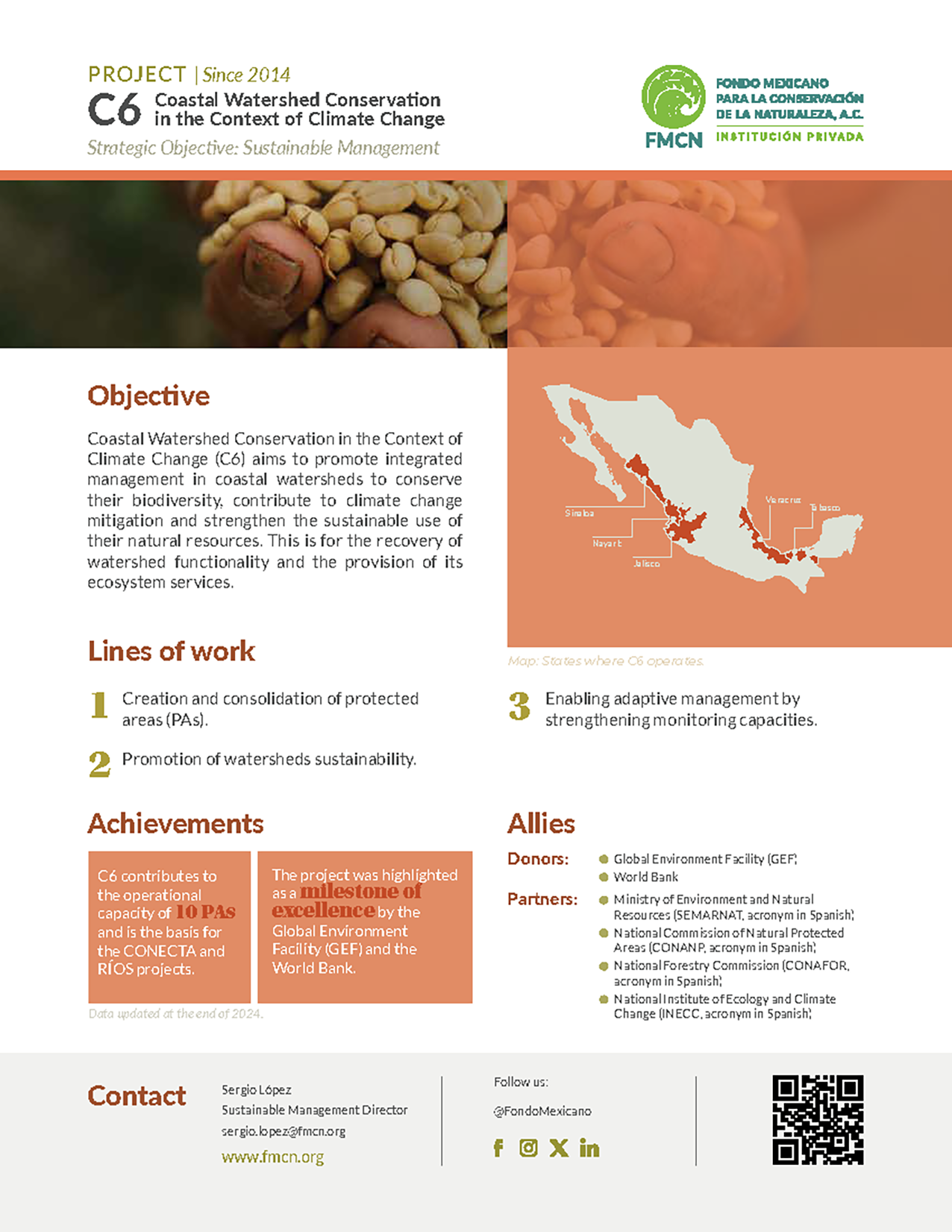 The C6 project had a successful operation between 2013 and 2018, during which it strengthened the management of ten Protected Areas (PAs) through the strategic use of patrimonial resources. It also fostered community participation and promoted collaboration with the Gulf of Mexico Fund (FGM, acronym in Spanish) and FONNOR (Northwestern and Western Fund). This partnership enabled the efficient and transparent use of resources, maximizing their impact on the territory.