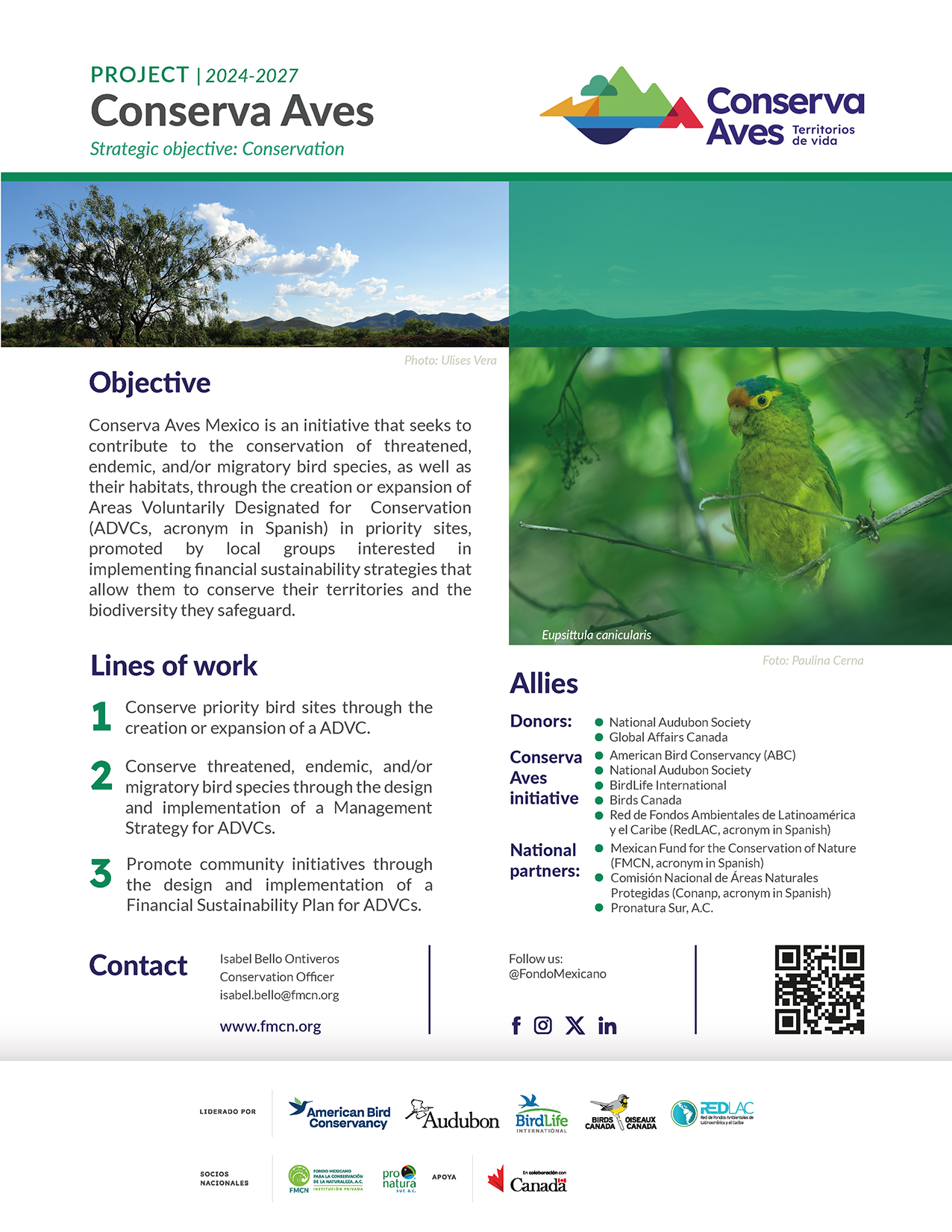 In this context, Conserva Aves México aims to contribute to the conservation of threatened, endemic, and/or migratory bird species, as well as their habitats, through the certification or expansion of Areas Voluntarily Designated for Conservation (ADVCs, acronym in Spanish) in priority sites. It also supports local groups seeking to implement financial sustainability strategies to conserve their territories and the biodiversity they safeguard.