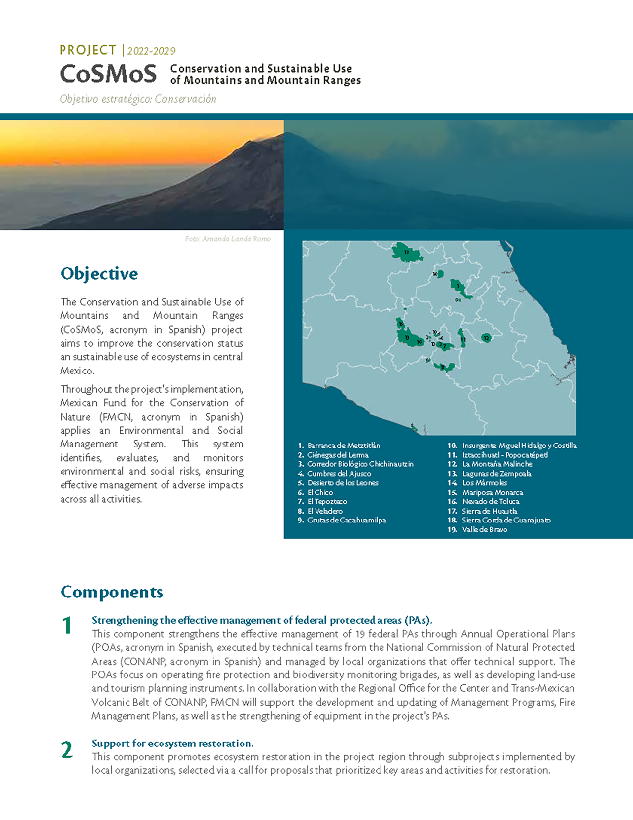 Conservation and Sustainable Use of Mountains and Mountain Ranges (CoSMoS, acronym in Spanish) aims to improve the conservation status and sustainable use of ecosystems in central Mexico.
