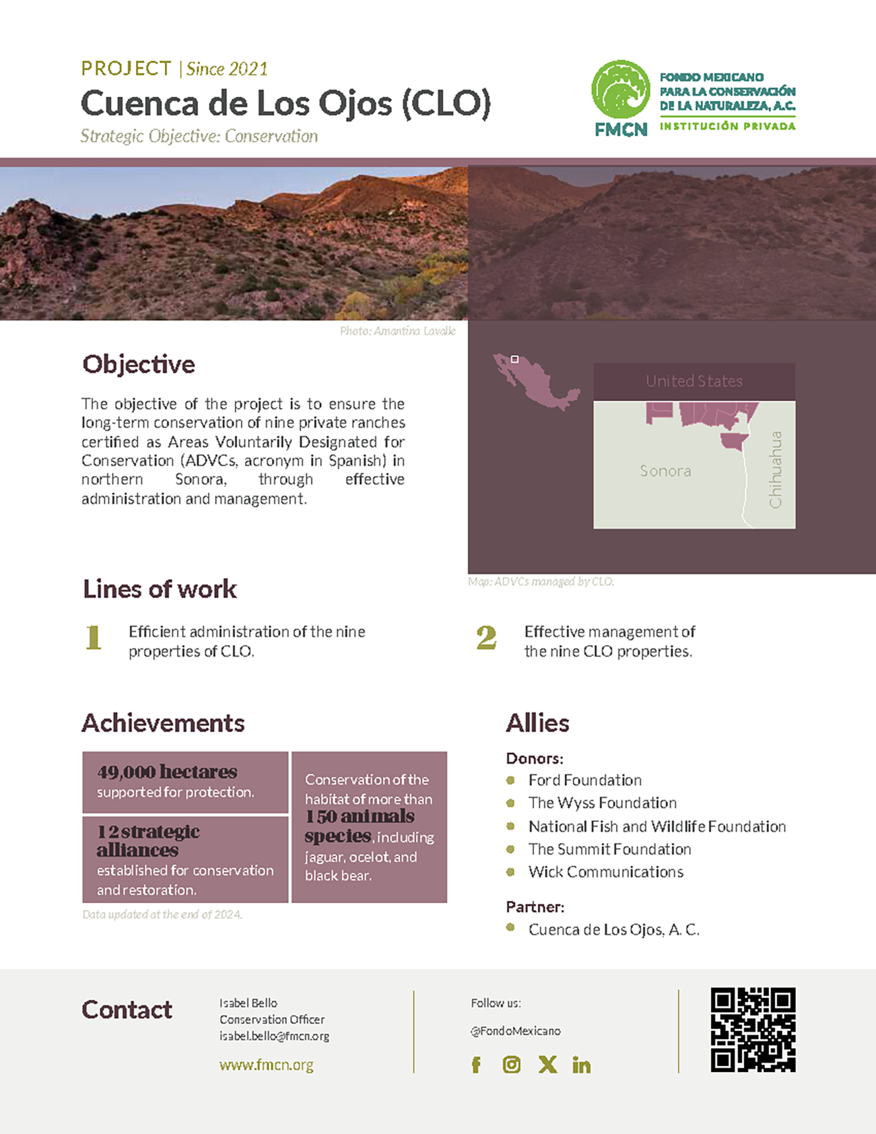 The organization Cuenca de Los Ojos, A.C. (CLO) manages the ADVC of the same name, located in northeastern Sonora and made up of nine privately owned ranches. For over 30 years, CLO’s team has worked on the conservation and restoration of the ecosystems in the border region between Mexico and the United States, with the goal of protecting the region’s natural capital. This is where the Sky Islands, Sierra Madre Occidental, Chihuahuan Desert, and Sonoran Desert converge, creating a uniquely rich biodiversity of flora and fauna.