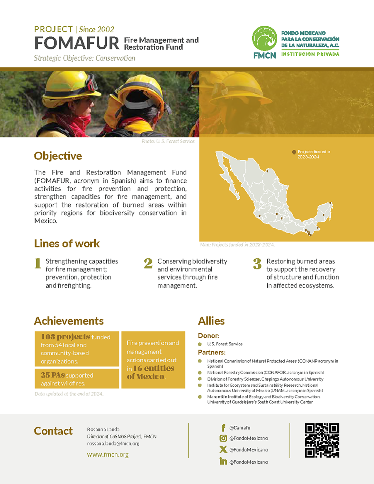 In 2002, through an endowment, FMCN created Fomafur to provide permanence to fire management activities. Through biannual calls for proposals aimed at organizations and rural and indigenous communities, Fomafur seeks to strengthen and implement current public policies on the conservation of Mexico’s biodiversity and forest ecosystems (General Law for Sustainable Forest Development and the Fire Management Program 2020-2024). Fomafur is aligned with international forest fire protection and management trends (United Nations Environment Programme – 2022; Spreading like Wildfire – The Rising Threat of Extraordinary Landscape Fires; A UNEP Rapid Response Assessment; Nairobi).