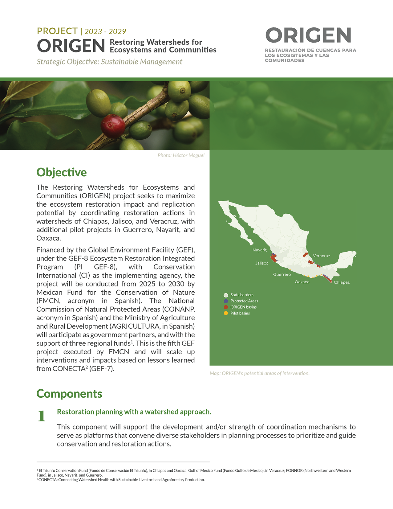 The project will be implemented in coastal watersheds in Chiapas, Jalisco, and Veracruz, as well as in pilot watersheds in Guerrero, Nayarit, and Oaxaca. Restoration efforts will focus on degraded areas and on strengthening the value chains of native Mexican species, such as vanilla and cacao, while also promoting agroforestry and silvopastoral systems. High priority will be given to field actions that are expected to deliver long-term environmental, economic, and social benefits.