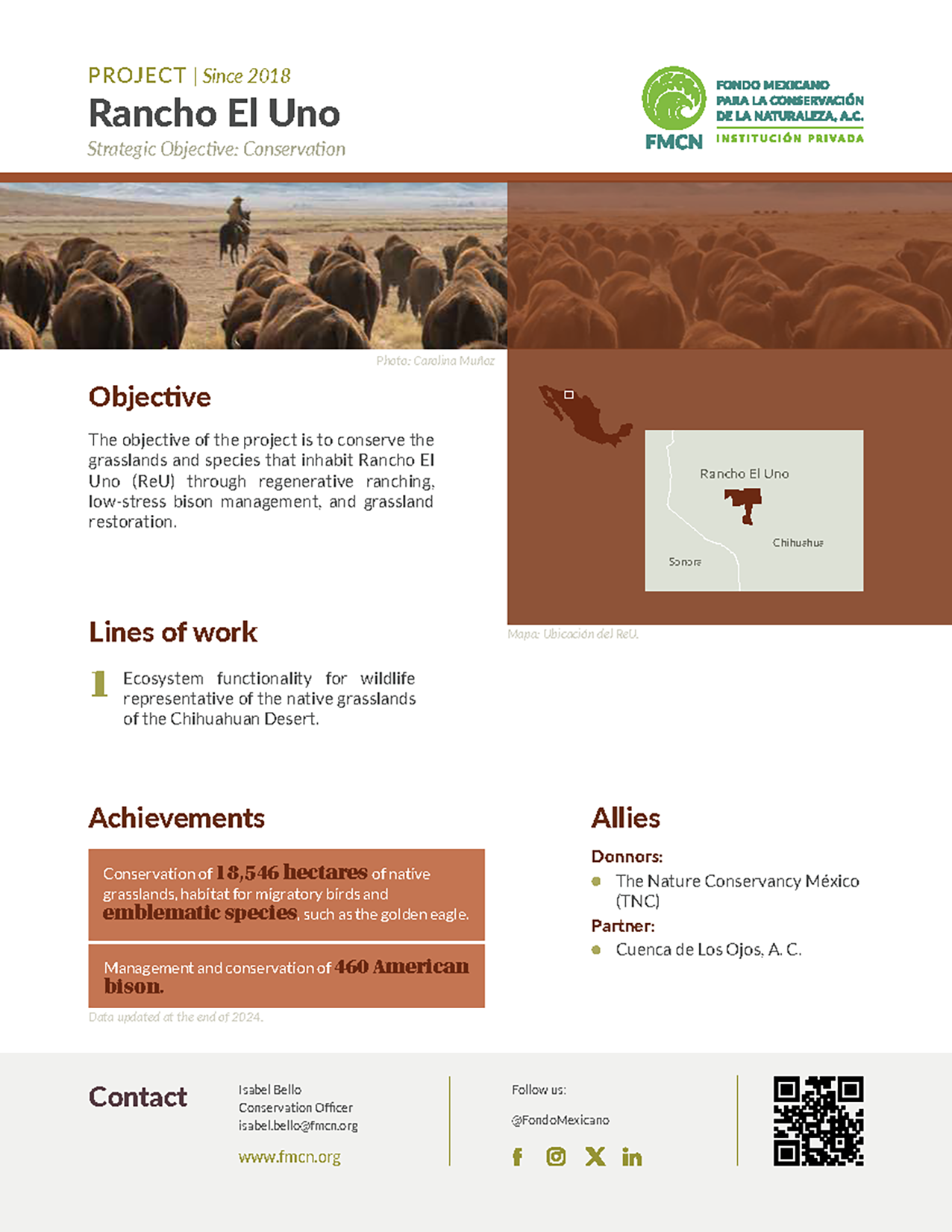 The operation and management of ReU is led by the organization Cuenca de Los Ojos, A.C. (CLO), which has over 40 years of experience in restoring and protecting grasslands in northeastern Sonora, as well as in regenerative ranch management. The collaboration between CLO and FMCN is formalized through a donation agreement that is renewed annually.