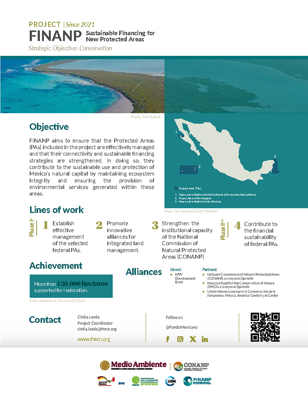 • FINANP II, managed by FMCN, has patrimonial resources for operating three federal PAs, the Mexican Caribbean and Pacific Islands Biosphere Reserves of the Baja California Peninsula and Revillagigedo National Park. The strengthening of the operation of these PAs is through the Fund for the Protected Areas Fund (FANP, acronym in Spanish) mechanism, based on the financing of conservation actions, in a five-year strategic planning.