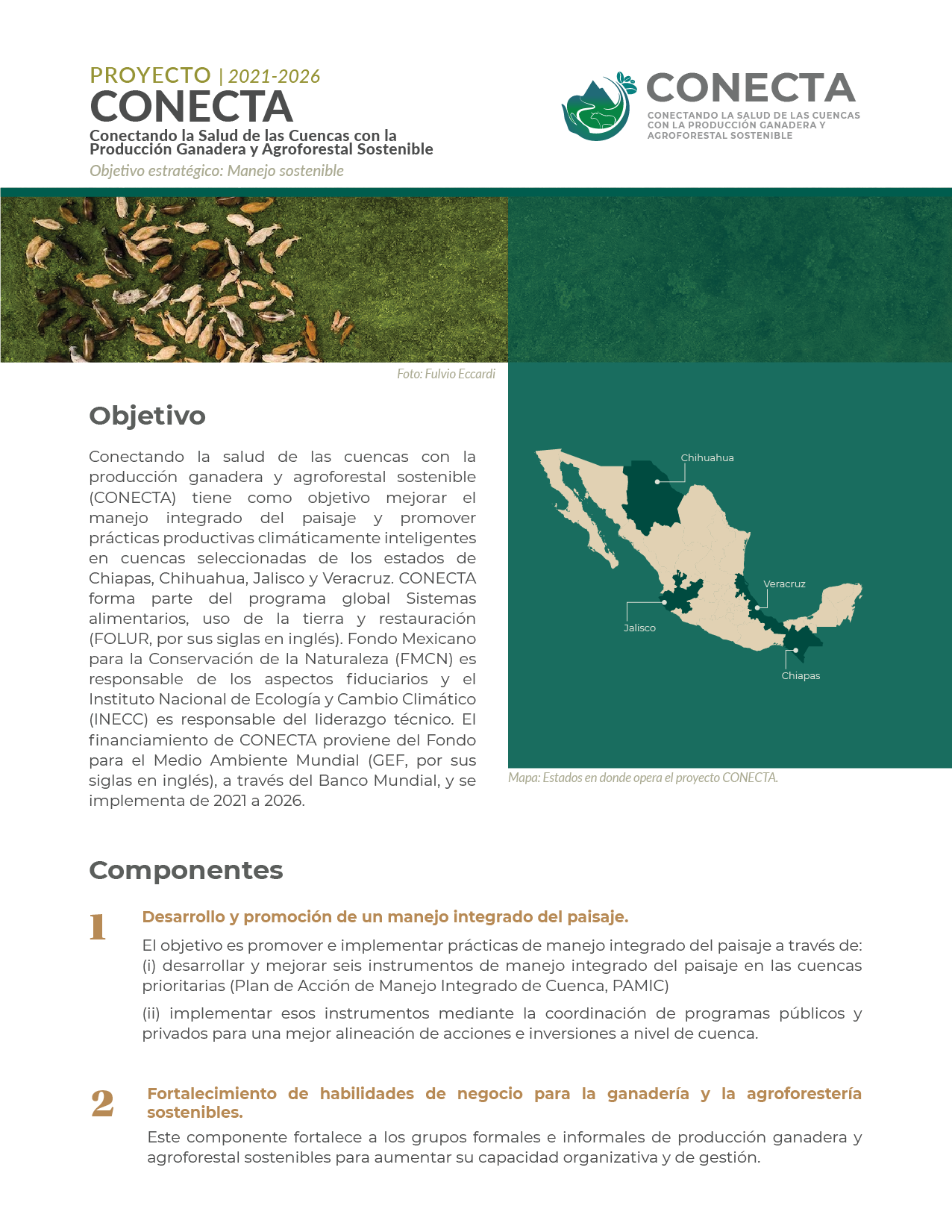 El proyecto Conectando la salud de las cuencas con la producción ganadera y agroforestal sostenible (CONECTA) tiene como objetivo mejorar el manejo integrado del paisaje y promover prácticas productivas climáticamente inteligentes en cuencas seleccionadas de los estados de Chiapas, Chihuahua, Jalisco y Veracruz.