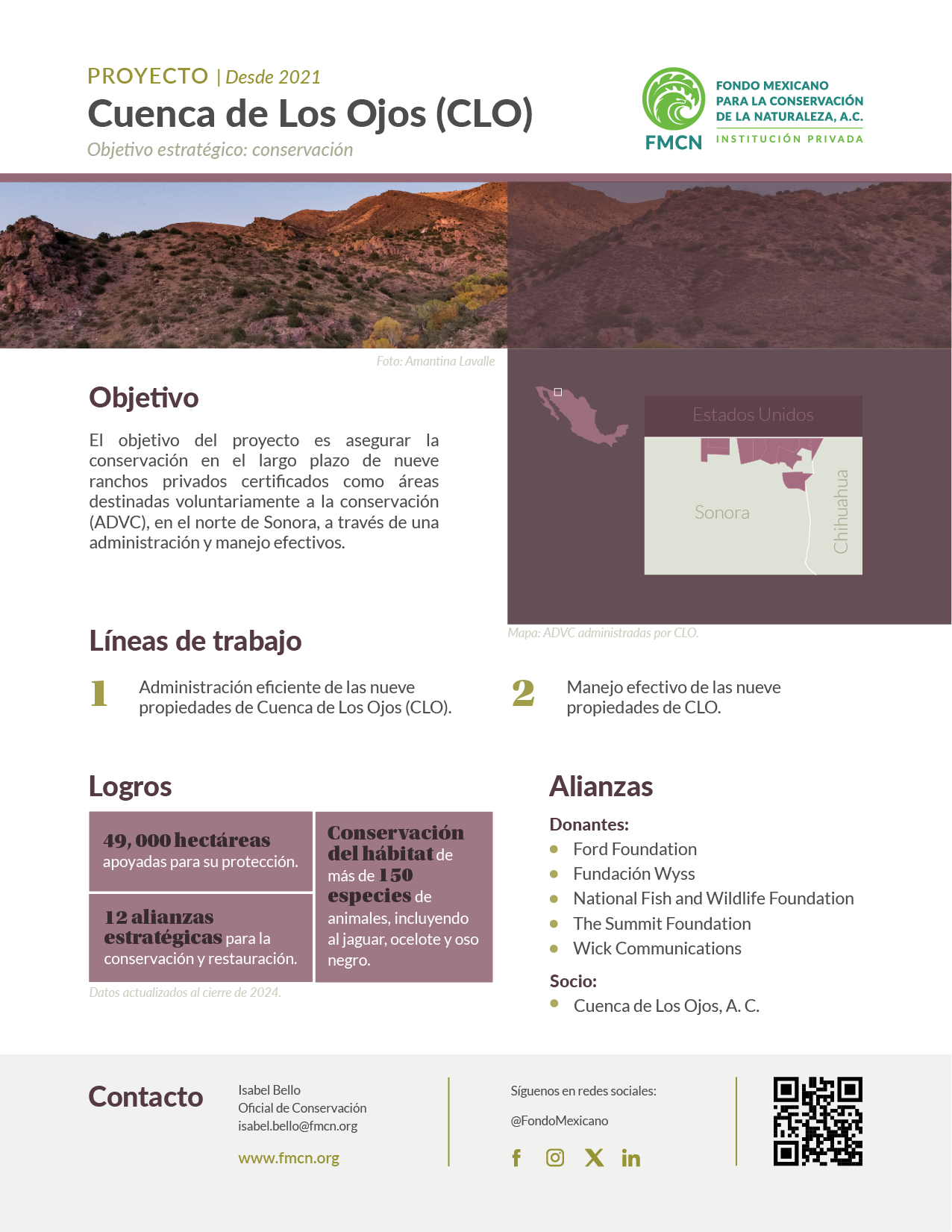 La organización Cuenca de Los Ojos, A.C. (CLO) administra el ADVC con el mismo nombre, ubicada al noreste de Sonora y conformada por nueve ranchos de carácter privado. Desde hace más de 30 años, el equipo de CLO ha trabajado en la conservación y restauración de los ecosistemas presentes en la región fronteriza entre México y Estados Unidos con el objetivo de proteger el capital natural de esta región, donde se ubican las Islas del Cielo, la Sierra Madre Occidental, el Desierto Chihuahuense y el Desierto Sonorense, combinación que genera una biodiversidad única de flora y fauna.