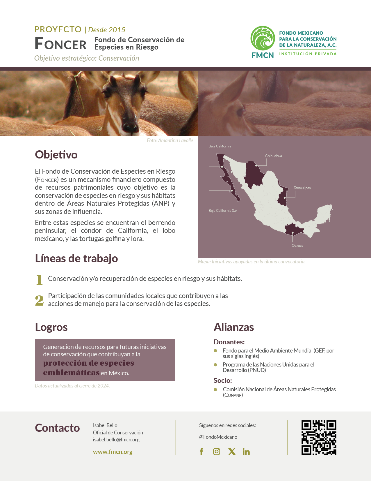 En 2022, concluyó la última convocatoria de FONCER, “Conservación de especies en riesgo y sus hábitats”, enfocada en la conservación de especies críticas como las tortugas lora y golfina, el berrendo peninsular, el cóndor de California y el lobo mexicano. La participación de las comunidades tuvo un papel fundamental para su cumplimiento y ejecución. Por un lado, la capacitación y el trabajo de las brigadas comunitarias permitieron el monitoreo y la vigilancia de las tortugas lora y golfina, y del berrendo peninsular; además, la colaboración con instituciones escolares ayudó a difundir la importancia de la conservación de especies, como el cóndor de California; por otro lado, el trabajo en conjunto con las y los ganaderos de la región fortaleció las buenas prácticas ganaderas para conservar el lobo mexicano.