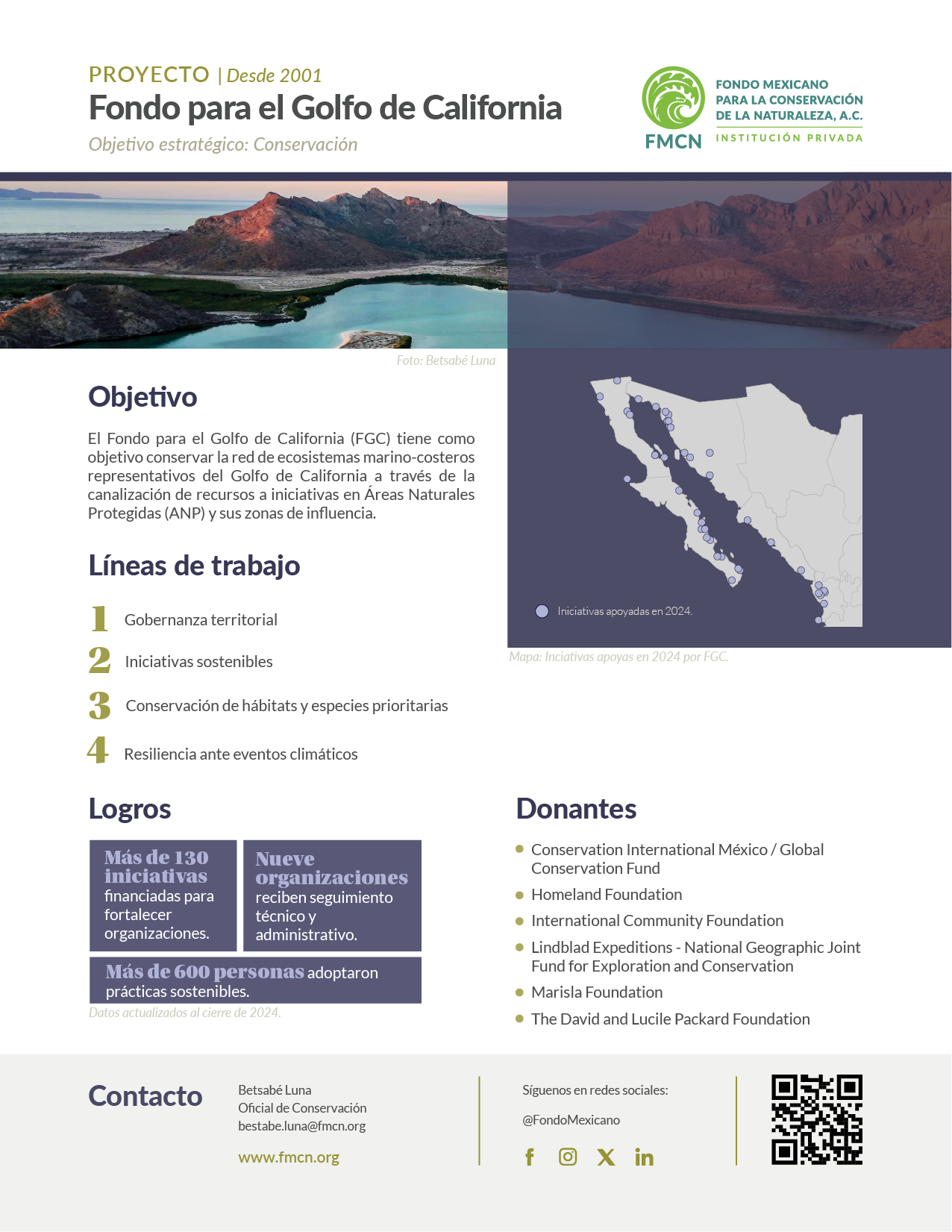 El Fondo para el Golfo de California (FGC) tiene como objetivo conservar la red de ecosistemas marino-costeros representativos del Golfo de California y Pacífico Norte a través de la canalización de recursos a iniciativas en ANP y sus zonas de influencia.