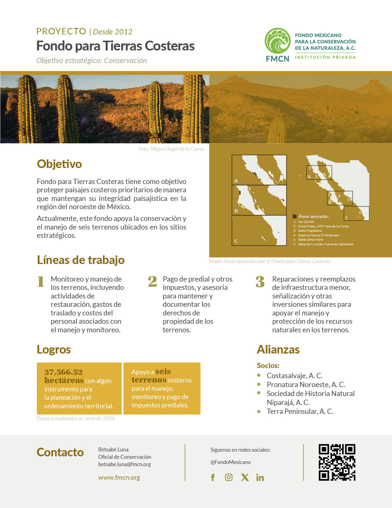 Desde 2012, Resources Legacy Fund (RLF, siglas en inglés) y Fondo Mexicano para la Conservación de la Naturaleza (FMCN) establecieron el Fondo para Tierras Costeras con aportaciones realizadas por RLF. Actualmente, este fondo apoya la conservación y el manejo de seis terrenos ubicados en los siguientes sitios estratégicos: 1) Valle de los Cirios; 2) Bahía Magdalena; 3) San Quintín; 4) Corredor de San Cosme; 5) Humedales de Sinaloa, y 6) Marismas Nacionales.
