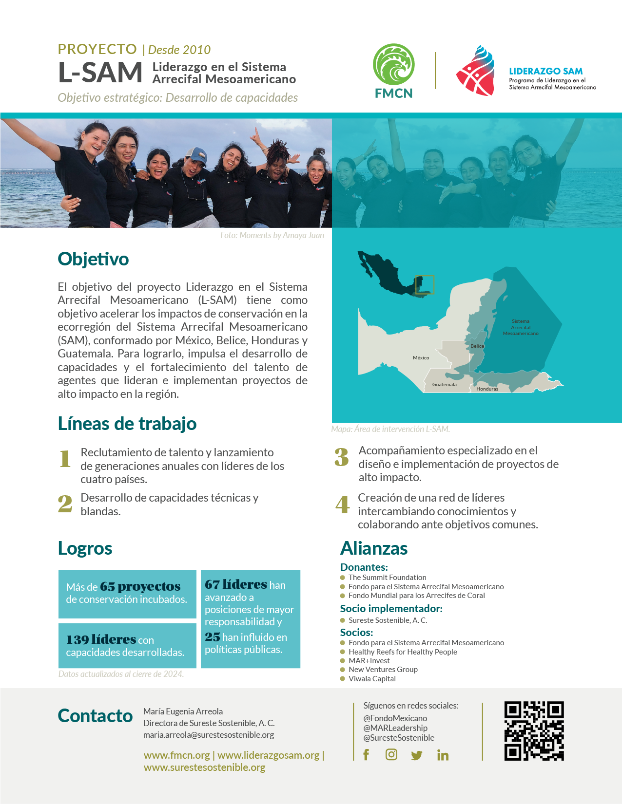 Liderazgo en el Sistema Arrecifal Mesoamericano (Liderazgo SAM) tiene como objetivo acelerar los impactos de conservación en la ecorregión del Sistema Arrecifal Mesoamericano (SAM), conformado por México, Belice, Honduras y Guatemala. Para lograrlo, impulsa el desarrollo de capacidades y el fortalecimiento del talento de agentes que lideran e implementan proyectos de alto impacto en la región.