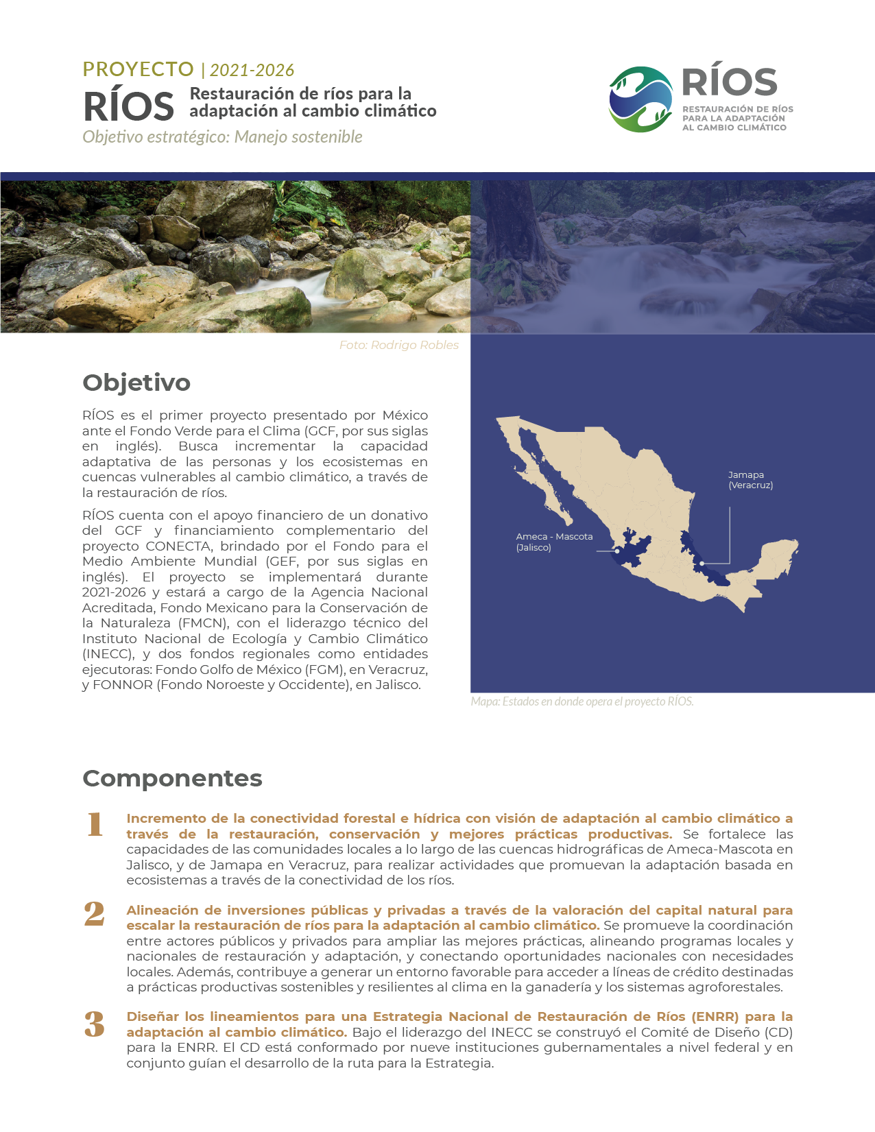 RÍOS es el primer proyecto presentado por México ante el Fondo Verde para el Clima (GCF, por sus siglas en inglés). Cuenta con el apoyo financiero de un donativo del GCF y financiamiento complementario del proyecto CONECTA, financiado por el Fondo para el Medio Ambiente Mundial (GEF, por sus siglas en inglés). La ejecución del proyecto a cinco años (2021-2026) está a cargo de Fondo Mexicano para la Conservación de la Naturaleza (FMCN), con el liderazgo técnico del Instituto Nacional de Ecología y Cambio Climático (INECC), y dos fondos regionales como entidades ejecutoras: Fondo Golfo de México (FGM) en Veracruz; y FONNOR (Fondo Noroeste y Occidente) en Jalisco.